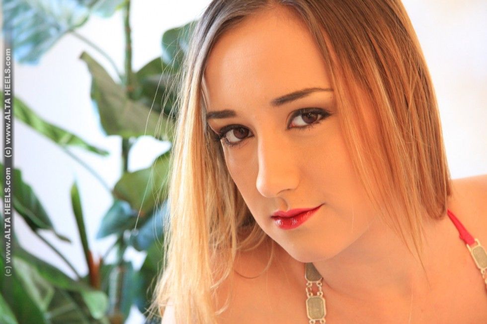 Pornstar Alyssa Reece posing in seamless pantyhose and black high heels