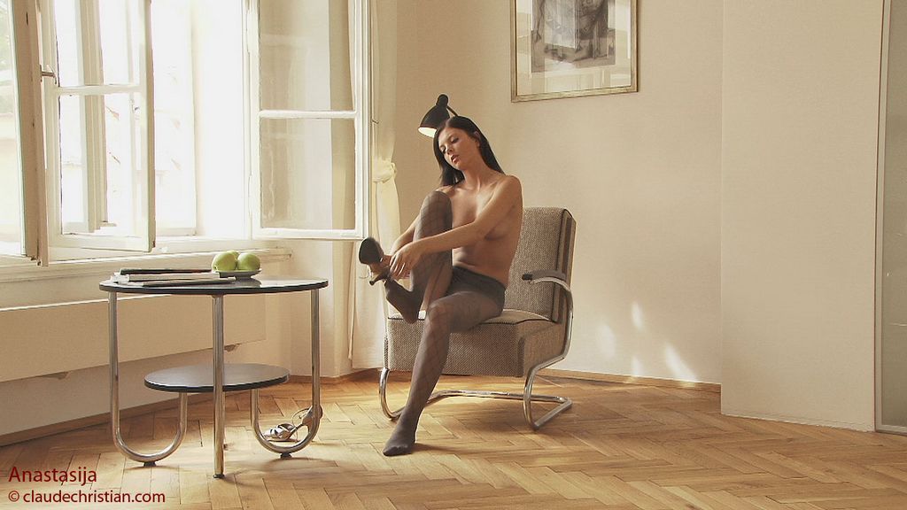 Brunette Dana in tight short skirt and pantyhose, also high heels, slowly take off her top and skirt. This girl is so beautiful if she dressed in pantyhose only