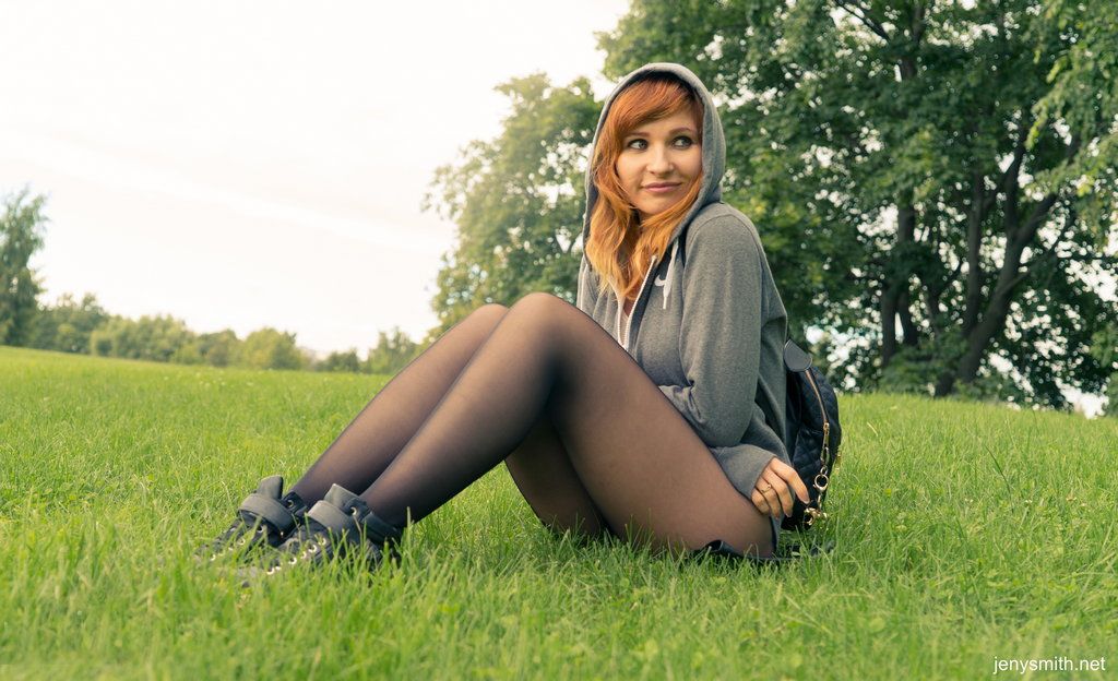 A walk in the nature with Jeny Smith in black seamless pantyhose without any underwear