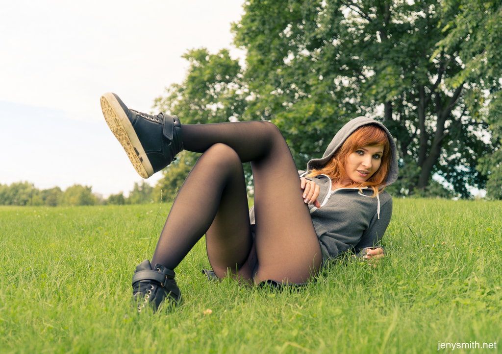 In an autumn park, the redheaded girl named Jeny removes her skirt to pose seductively in her seamless blue pantyhose, wearing only a leather jacket and high boots
