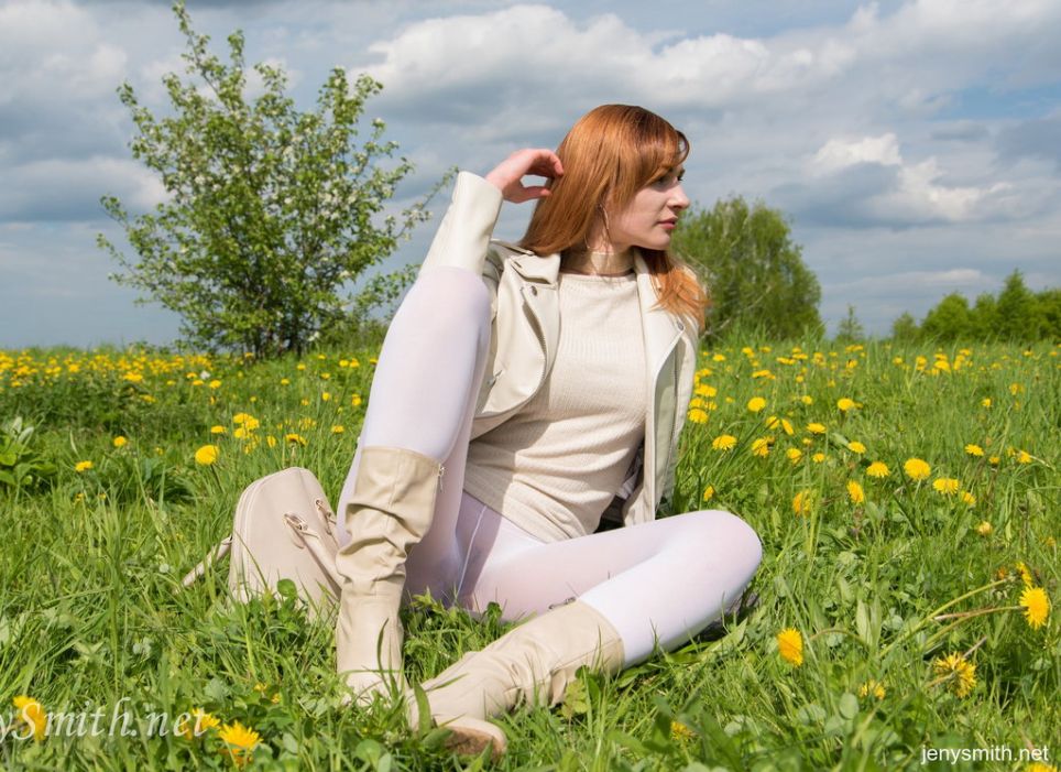 In an autumn park, the redheaded girl named Jeny removes her skirt to pose seductively in her seamless blue pantyhose, wearing only a leather jacket and high boots