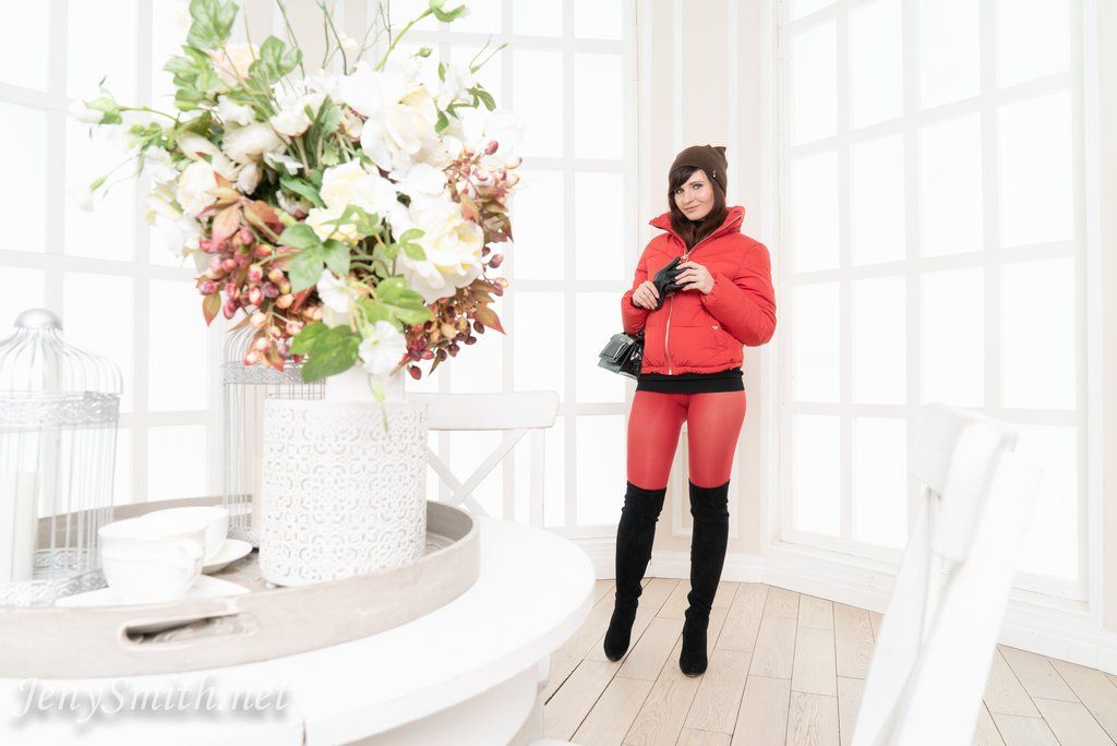 In an autumn park, the redheaded girl named Jeny removes her skirt to pose seductively in her seamless blue pantyhose, wearing only a leather jacket and high boots