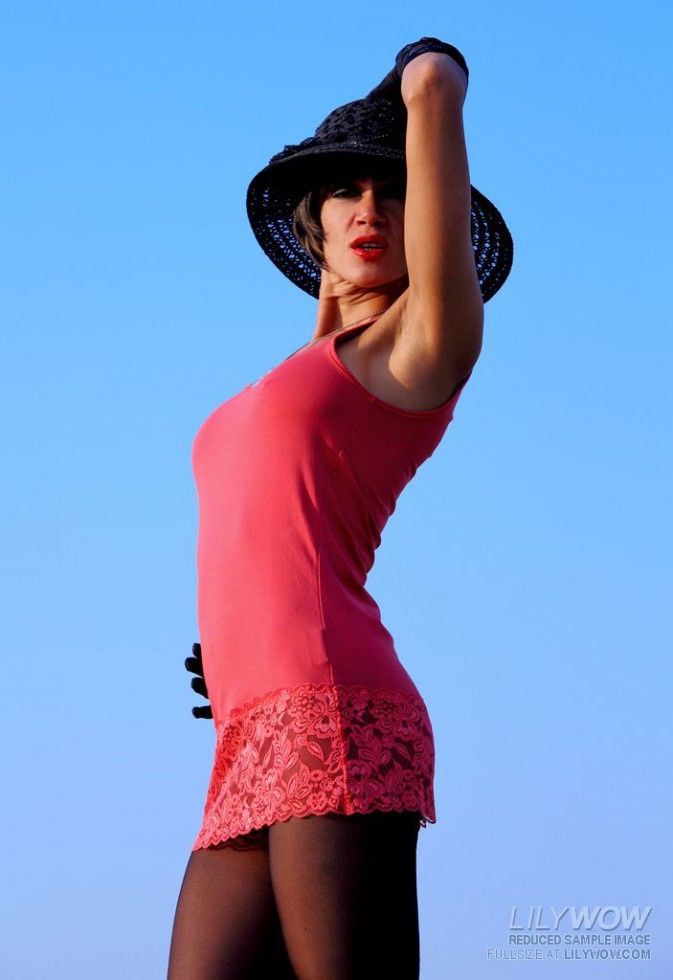 Sexy leggy Eva Diangelo in nude pantyhose and latex boots teases outdoor