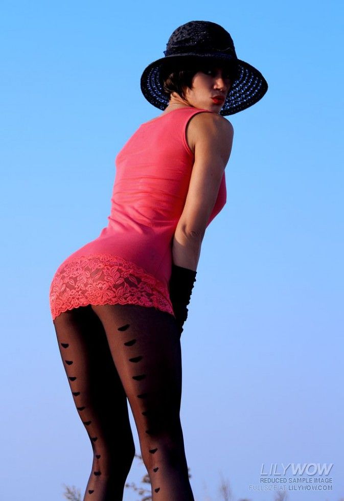 Long legged Eva Diangelo pulls up her black sheer pantyhose to her tits