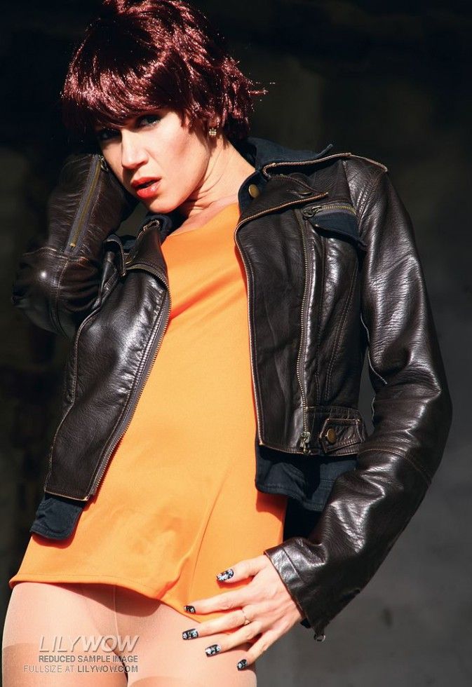 Sexy leggy Eva Diangelo in nude pantyhose and latex boots teases outdoor