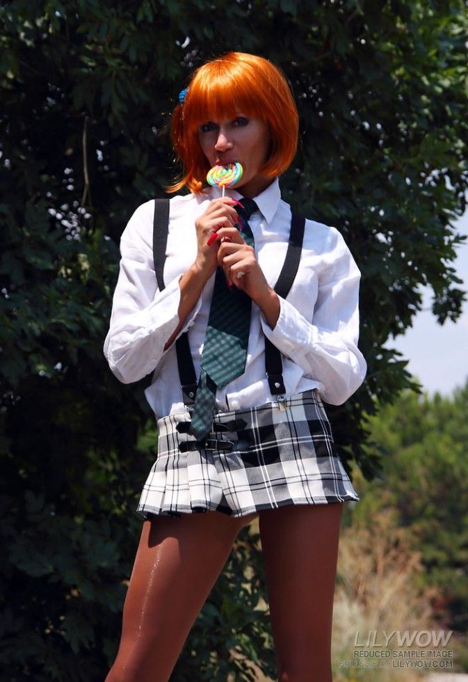 Eva Diangelo in high heels and pantyhose shows her long legs