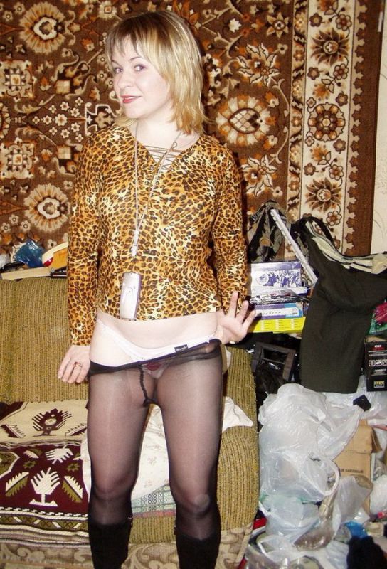 Some pictures from the private photo album of hot housewife pulling up her sheer tan pantyhose on her tits