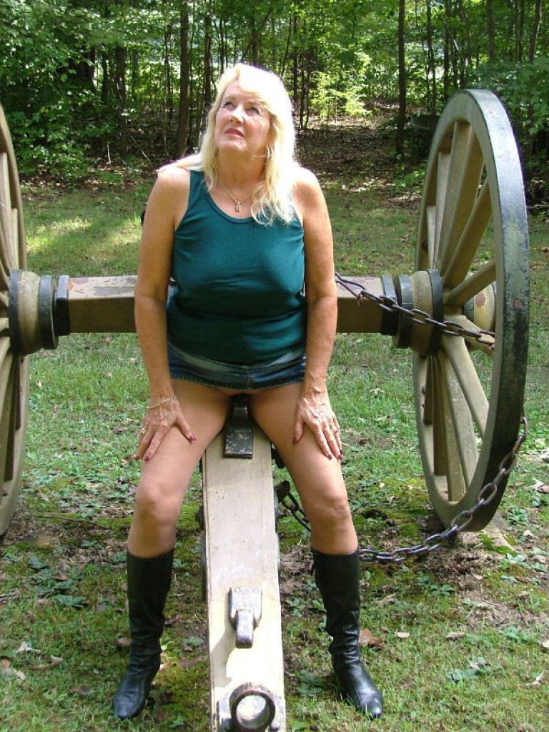 Busty mature Barby Slut in black pantyhose shows off her goodies in the open air