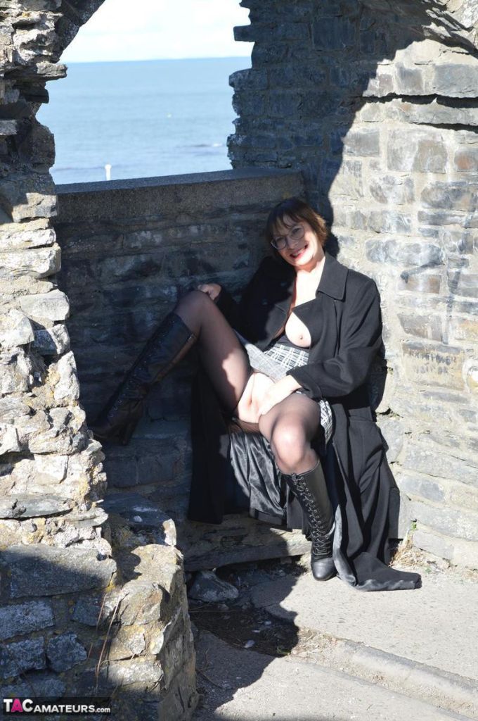 Busty mature Barby Slut in black pantyhose shows off her goodies in the open air
