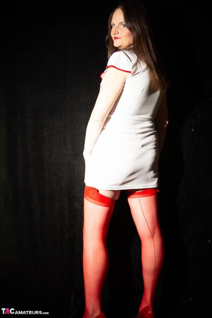 Busty MILF LuLu Lush in black satin dress and stockings