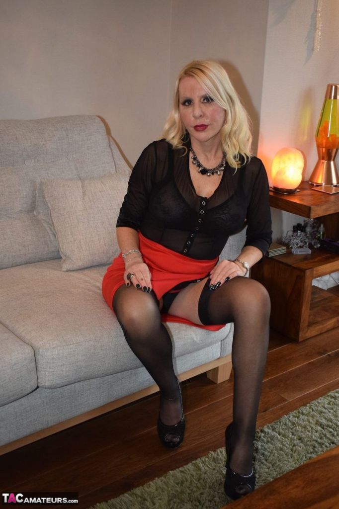 Chubby blonde MILF in black stockings and high heels having fun in the bathroom